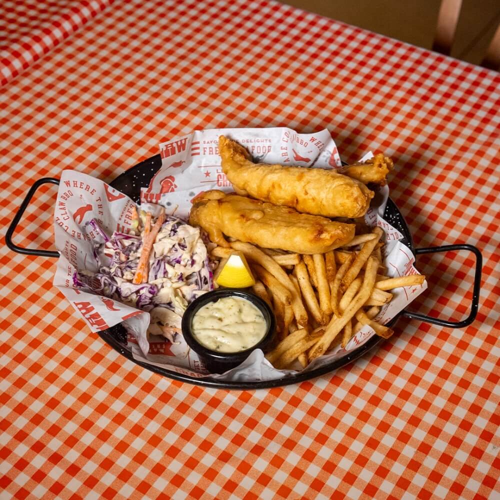 Chicken schnitzel, Claw’s signature salsa, pepper jack cheese served with chips + coleslaw.