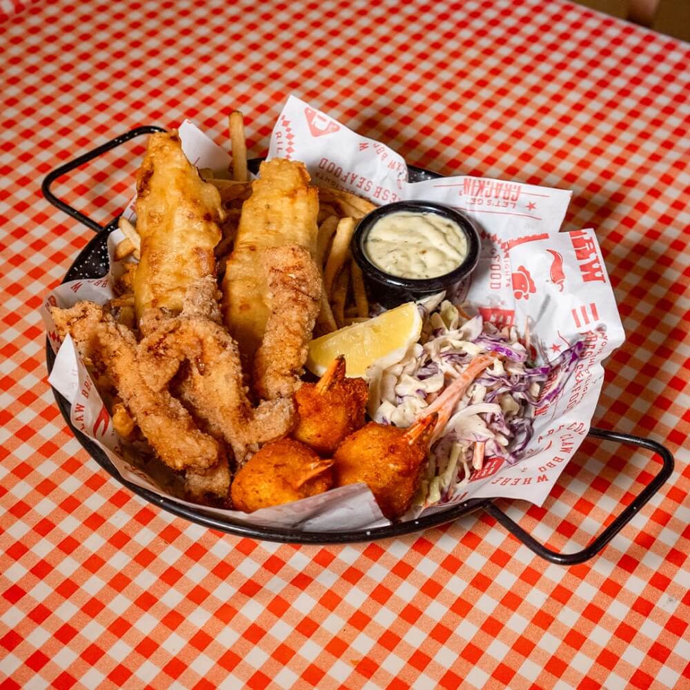 Served Hot. 1kg Crawfish, Prawns, Sand Crab, Bugs, New Potato and Corn. Please note the hot seafood buckets take 30 mins to cook (perfect takes time!)