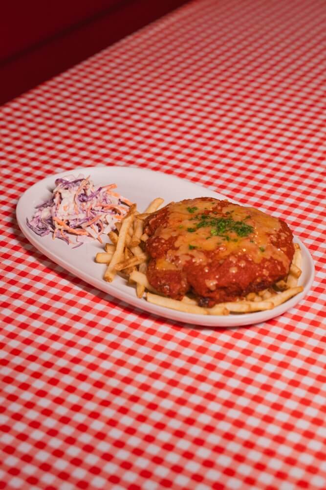 Crumbed chicken breast topped with rich tomato sauce, melted cheese, fresh herbs, served golden and crispy