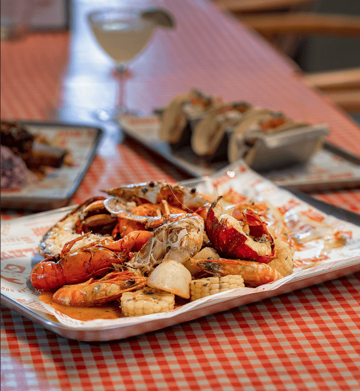 Get Stuck into our 1kg lobster tails, sand crab, prawns, potatoes & corn