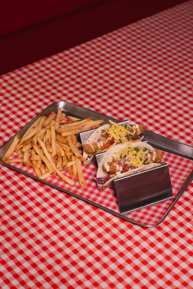 Two pieces soft shell. Made with seasoned battered fish fillets, slaw, tomato, red onion, scallions, cheddar cheese, sour cream, house made salsa and fries