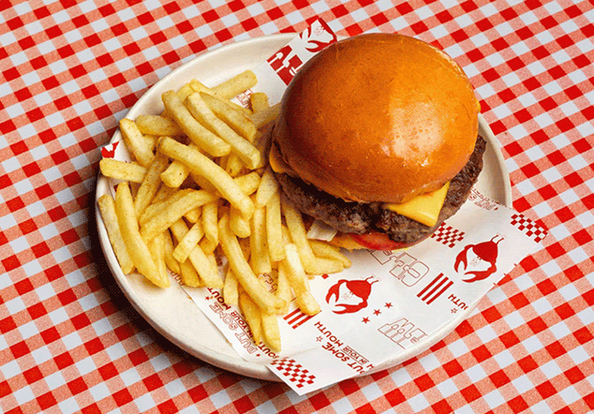 Classic cheeseburger served with chips OR carrot + cucumber fingers