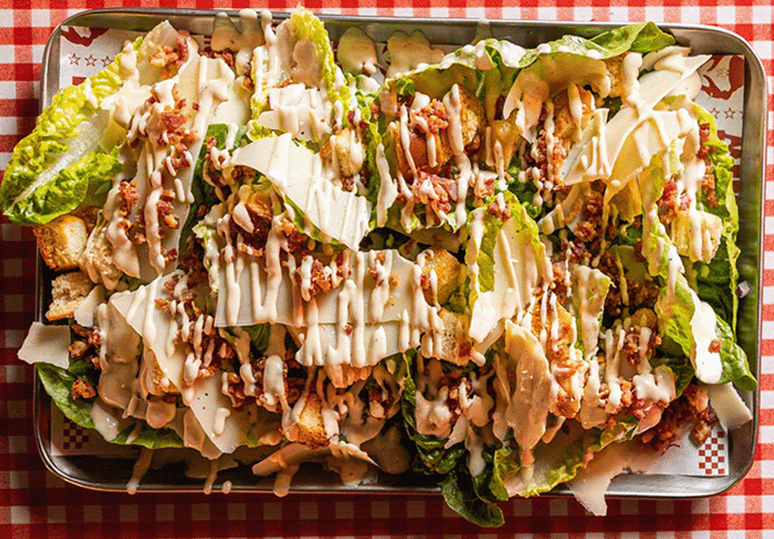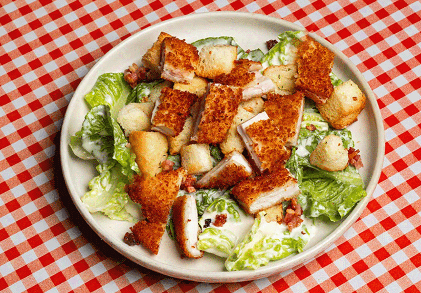 Crumbed chicken, hearts of crisp romaine lettuce, parmesan, crispy bacon bits, croutons in a creamy caesar dressing.