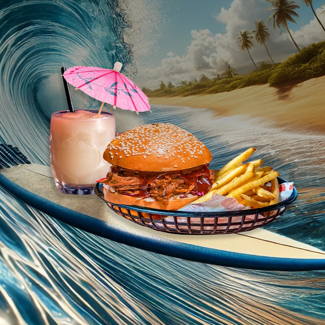 Grab a bite before the movies! Snag a Pulled Beef & Pineapple Slaw Burger with Pineapple Aioli & Fries, and a Tropical Trouble Slushie